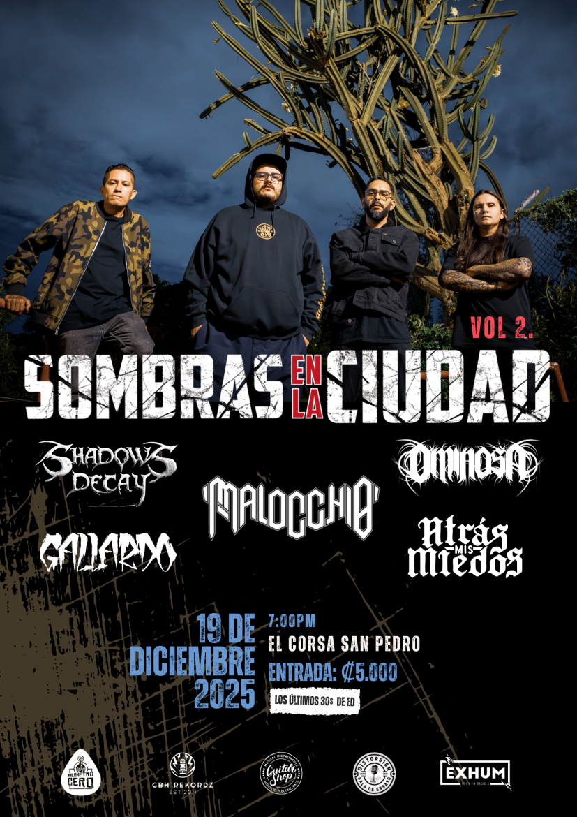 09 de diciembre de 2025. El ciclo de conciertos Sombras en la Ciudad, impulsado por la banda cartaginesa Malocchio, regresa con una segunda edición. El evento tendrá lugar este 19 de diciembre a las 7:00 p.m. en El Corsa, San Pedro, con la participación de cinco proyectos que representan distintas vertientes del metal y el hardcore.